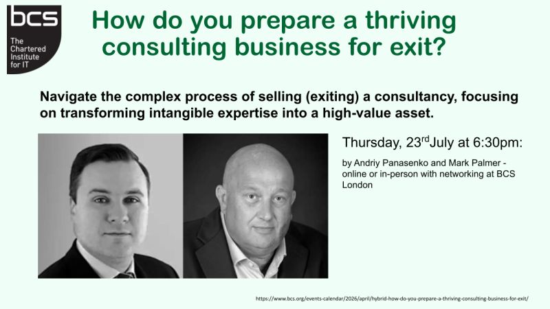 I am delighted to announce that I’ll be exploring this challenge in detail at the upcoming BCS, The Chartered Institute for IT (https://www.linkedin.com/company/it-bcs/) event: "How do you prepare a thriving consulting business for exit?"